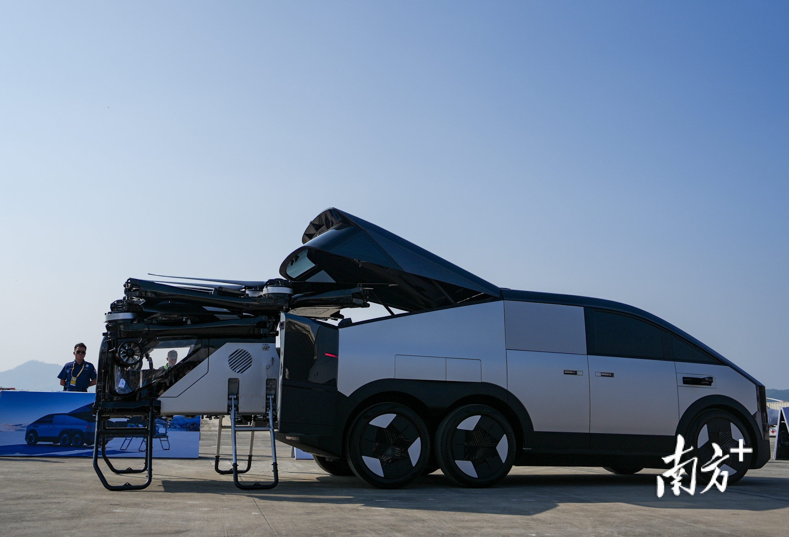 小鹏汇天“陆地航母”分体式飞行汽车演示飞行体从陆行体分离。